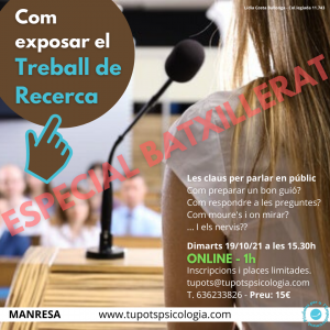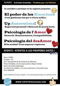 A Tu Pots Psicologia, el teu equip de psicòlegs a Manresa tant presencialment com en línia, organitzem activitats i tallers per oferir-te recursos pràctics per al teu creixement personal, acadèmic i professional.